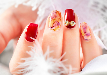 Blooming gel is a colorless, transparent and very fluid gel. The manicure in the picture has a red base color with gold decorations to give people a feeling of richness and a strong sense of vision. The fireworks-like color of the blooming flower makes the nail more layered, and the overall effect is more beautiful. And the ever popular blush nails are also completed with the use of blooming gel!