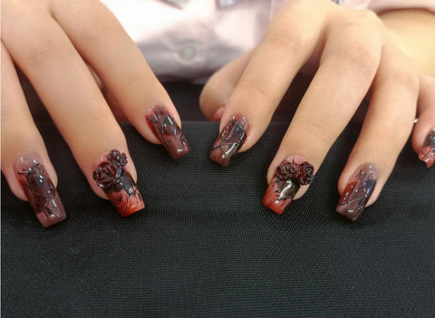 Halloween manicure should have a bloody feeling. Red and black base can be very create a dark and scary atmosphere. The bloody roses on the manicure have a fierce feeling, which makes the dark style more endowed with visual sense. The irregular red halo on the surface of the nail creates a three-dimensional image, which makes people feel chills at the back. This nail art is very suitable for horror Halloween party!