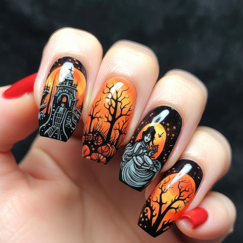 This set of manicure has the classic pumpkin colour as the base, with the church and dead trees to deepen the horror atmosphere. In the dark church, there may be black ghosts floating around. Under the dim moonlight, the withered tree branches seem to be the ghostly hands reaching out in the darkness, and the crows flying up from time to time in the forest are all frightening. I wonder if there is a pumpkin spirit with a creepy smile in the depths of the forest? This is a typical Halloween nail art!