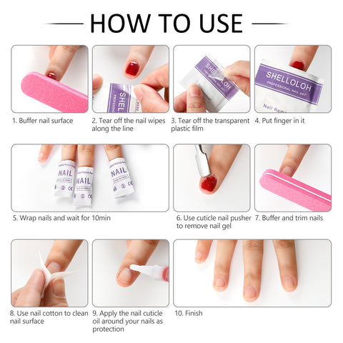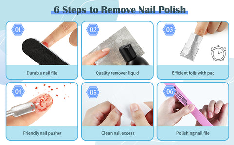 First use a nail file in the same direction to erase the top coat. Wipe the powder off and you're ready for the next step. Prepare the nail polish remover by pouring it into the foil nail wraps. Then wrap your nails. Leave on for 3-5 minutes to remove and use the cuticle pusher to gently push off the nail polish. After removing the nail polish use a nail file to remove the involved nail polish and polish the nail surface.Then you can use nail cotton to clean nail surface. If you have nail cuticle oil, it is also a good choice to apply it around your nails. Nail cuticle can protect your nails.