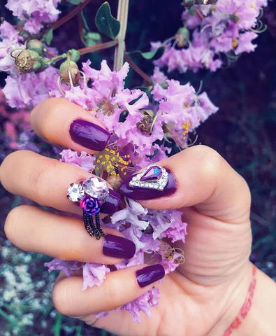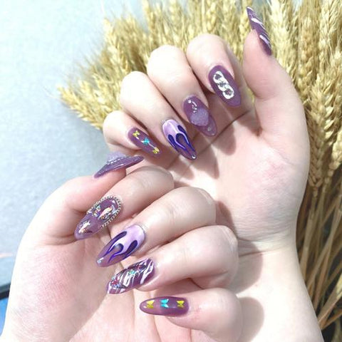 This manicure is simple and beautiful. We use purple nail polish as a base, and then we can choose beautiful nail decorations to complete our manicure. The picture uses flowers and nail diamonds of the same color for decoration. Of course, we can also try other different colors, such as the red and blue mentioned at the beginning of the article. I believe that no matter what color it is, it will be full of mystery with a purple tone.