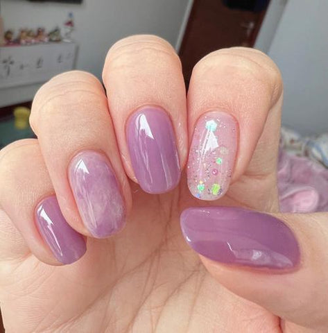 This sparkling purple manicure looks like a vast universe dotted with stars. You can buy gel polish with sequins for this kind of manicure, such as QZ04. Or you can buy a bottle of solid color nail polish with a sequin topcoat, both of which will present stars on your fingertips.
