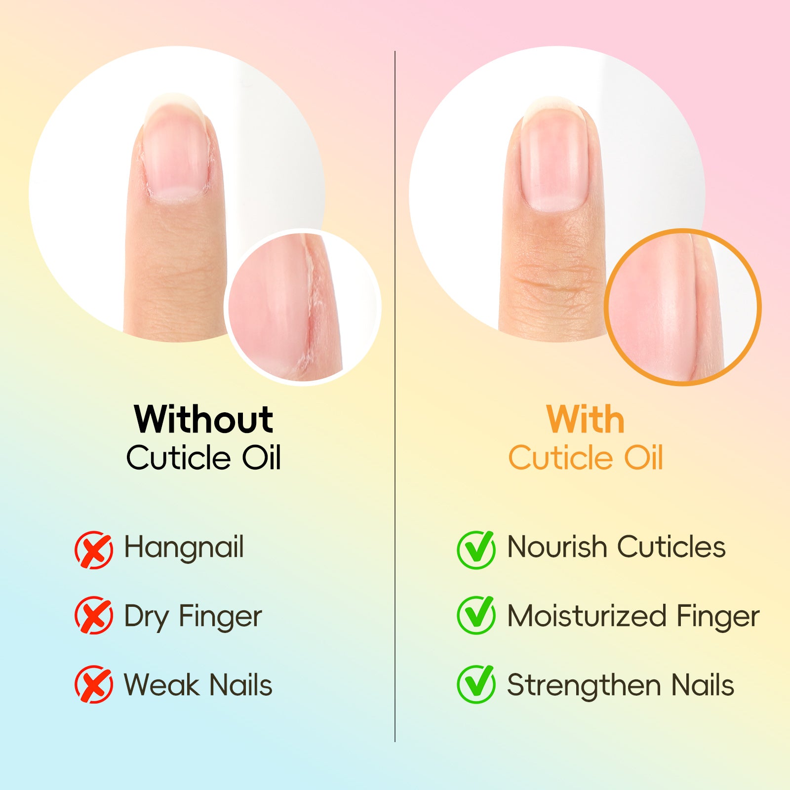 【Wide Use】 Our excellent cuticle oil formula is very effective in nourishing, protecting, and softening the skin on the smooth edge of the nail, it is good for healthy nail growth. Cuticle oil won't harm existing nail gel polish.